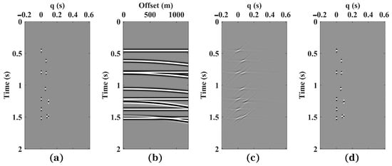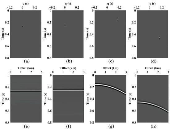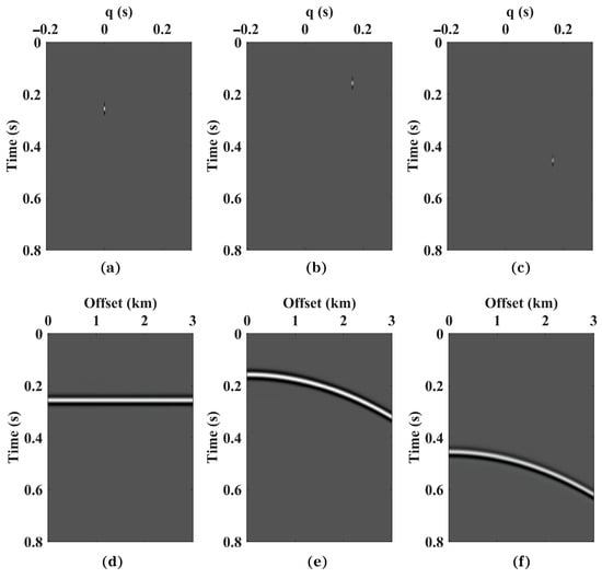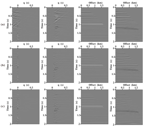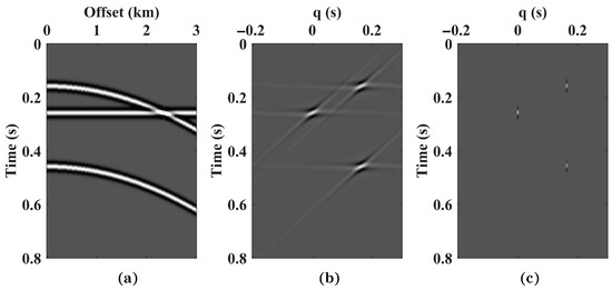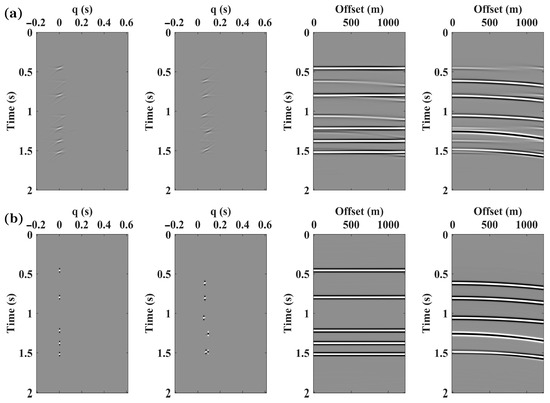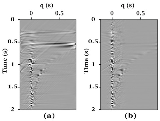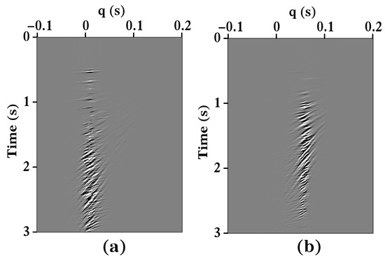 We perform the LSRT and EH-SRT to the NMO-corrected data and the estimated Radon model is shown in Figure 7a,b, respectively. The Radon model has the same time sampling and interval with seismic gather, with 101 slowness sampling points ranging from −0.2 to 0.8. It is apparent in Figure 7a that the Radon model of the LSRT is divergent in shallow layers, which is caused by the stack of limited traces after muting the NMO stretching [25], while the Radon model of EH-SRT is sparser than the LSRT result not only in the low layers but also in the deep region. The velocity for NMO correction is known to be absolutely accurate, resulting in the correction of primaries from parabolic to flat. Consequently, the Radon coefficients of the primary are aligned along a line where its horizontal ordinate is . However, the Radon coefficients of multiple vary with depth and slowness, and the deeper the layer is, the closer the Radon coefficients of multiples are to primaries.