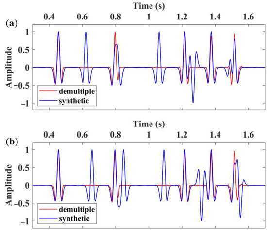 To more clearly verify the effectiveness of the proposed approach in multiple removal, we select a near-offset trace at m and a far-offset trace at m to conduct the amplitude comparison before and after multiple elimination. It is crucial to note that only the demultiple result based on the EH-SRT model is employed in this test. In Figure 5a, the amplitude comparison of the near-offset trace is presented, where the blue line represents the amplitude of the synthetic data, and the red line represents the amplitude of the recovered primaries. It is apparent that there are obvious multiples at 0.6 s, 1.05 s, and 1.25 s, while the multiples at 0.8 s and 1.5 s are not easily discovered. This is because multiples overlap with primaries, leading to waveform variations in both types of reflections. Through comparison, it can be observed that GMD-R can not only suppress the obvious multiples but also recover primaries affected by multiples at 0.8 s and 1.5 s. This achievement can be attributed to the precise separation of primary and multiple coefficients achieved in the Radon domain. The far-offset trace comparison is displayed in Figure 5b, where multiples exhibit a certain time shift compared with Figure 5a. The waveform variations in Figure 5b reaffirm the conclusion drawn from Figure 5a, highlighting the ability of GMD-R to effectively suppress multiples and recover primary signals.