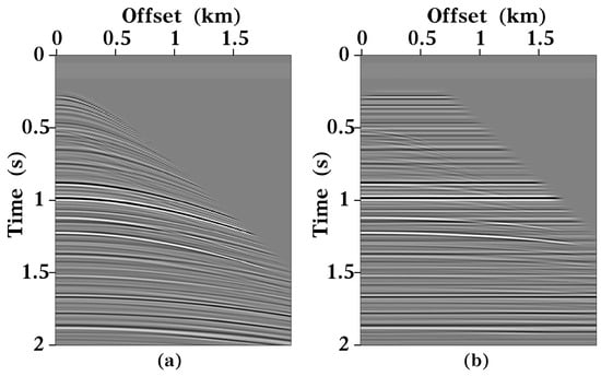 where represents the Radon parameter including intercept time and slowness parameters , denotes the k-th decomposed mode, is the input data, and represents the predefined number of decomposed modes. denotes that the NMO correction is implemented to mode and the corrected mode has a Radon parameter . The optimization problem of Equation (18) can be understood in three parts: (1) decomposing the input data into a combination of modes with different Radon parameters ; (2) performing NMO correction to the decomposed mode ; and (3) after NMO correction, minimize the norm of the derivation to ensure the smoothness of along x-axis.