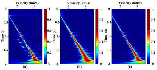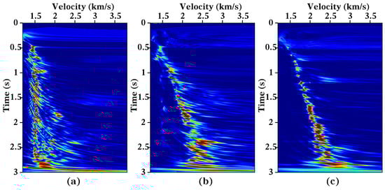 Velocity spectrum of (a) the synthetic data, (b) the recovered primaries with Radon filter method to the EH-SRT model, and (c) the recovered primaries with GMD-R method to the EH-SRT model.