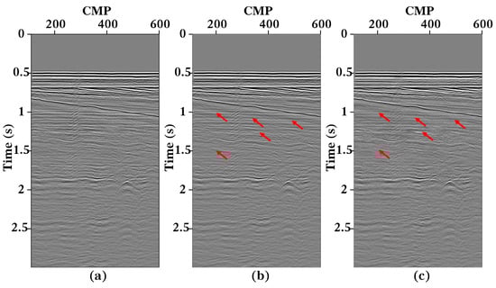Figure 15a–c shows the stack profile of the raw data, the demultiple result of the filter method and GMD-R method, respectively. Compared with the stack profile before multiple elimination, the filter method and GMD-R method both suppress several multiples. However, there are still some multiple residuals in Figure 15b while these multiples are absent in Figure 15c, especially in the areas pointed by the red arrows. From this point, we can recognize that the proposed method obtains a better result in multiple suppression.