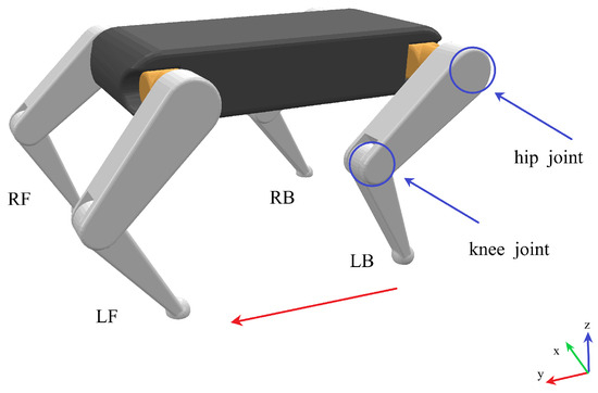 The quadruped robot used in this work is shown in Figure 1, which is 0.8 m long, 0.7 m wide and 0.732 m high. The robot has four legs, which are named left-front leg (LF), right-front leg (RF), left-back leg (LB) and right-back leg (RB). For each leg, two joints are considered, named the hip joint and the knee joint as shown in Figure 1.