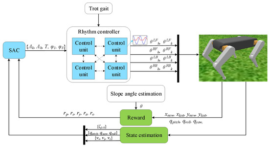 In this paper, a quadruped robot adaptive locomotion learning control architecture algorithm is proposed, and the algorithm structure framework is shown in Figure 3. The algorithm mainly consists of the Soft Actor Critic (SAC) and a rhythm controller based on a cosine oscillator, in which four control units constitute the rhythm controller and directly output the angle required by the eight joints of the robot, while the SAC algorithm is used to learn the parameters required by the controller. In addition, in order to reduce the number of parameters of the controller, the trot gait is integrated into the rhythm controller. Moreover, in order to better adapt the robot to the irregular environment, a slope angle estimation method is proposed, and the angle information is considered in the reward function.