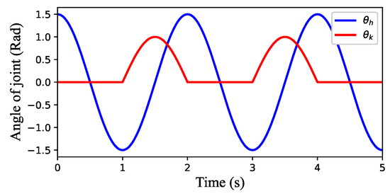 where is the signal of the hip joint, is the signal of the knee joint, represents the amplitude of the hip joint and represents the amplitude of the knee joint. Figure 4 shows that the single-legged control unit output when , , , , . It can be seen from the picture that the motion waveform of the hip joint is full wave and that of the knee joint is half wave. From to , with one leg in the support phase, the hip rotates from 1.5 radians to −1.5 radians, and the knee does not move. From to , with the leg in the swing phase, the hip rotates from −1.5 to 1.5 radians, the knee rotates from 0 to 1 radians and then from 1 to 0 radians.