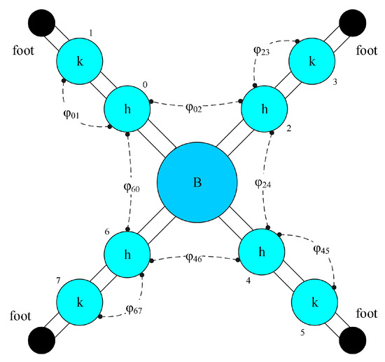 Four-legged rhythm controller structure, where the hip joints are represented by h, the knee joints are represented by k, B represents the body, and the dashed lines represent the coupling between two joints, represented by .