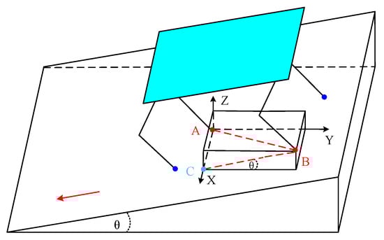 To make the robot move on the slope better, it is very important for the robot to obtain the angle of the slope. In this work, a slope angle estimation method was designed, so that the quadruped robot can know the slope angle according to the coordinates of its foot ends without the aid of cameras. The estimation process is shown in Figure 6, where the red and blue dots indicate the position of the foot endpoints.