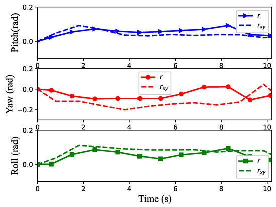 Figure 9 shows the changes in the robot’s body posture in the process of movement. The solid line represents the learning result using the reward function r in this paper, while the dashed line represents the learning result using only and as . It can be seen from the figure that the yaw angle of the robot can be greatly reduced after learning with the reward function r compared with that of the reward function . This is because the addition of the reward function is equivalent to the constraint on the robot’s attitude, and the pitch angle and roll angle are not large, so the constraint effect is not very obvious.