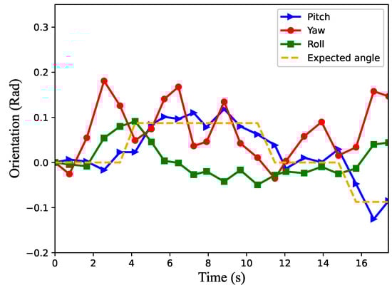 The blue line in Figure 13 represents the robot’s pitch angle, the red line represents the yaw angle, the green line represents the roll angle and the orange dashed line represents the expected pitch angle. By combining Figure 12 and Figure 13, we can learn that the robot starts to move uphill as shown in Figure 11b in about 4 s, arrives at the zero slope section in about 11.5 s as shown in Figure 11e and starts downhill as shown in Figure 11h in about 15.5 s. The speed of the robot on the uphill slope is smaller than that on the flat slope. It can also be seen that the robot’s pitch angle always follows the expected pitch angle during movement, that is to say, the robot could adjust its posture to adapt to the slope environment. In the process of movement, the maximum roll angle of the robot is no more than 0.1 radian, and it can be seen that the roll angle becomes larger when the robot starts to go uphill and downhill, while the rest of the rolling angle is small under stable conditions. Although the yaw angle of the robot in the uphill and downhill processes is larger than that in the flat movement, it can be seen from the X yaw direction that the robot movement does not produce a large yaw. Therefore, the algorithm proposed in this paper can help the robot learn better in climbing locomotion.