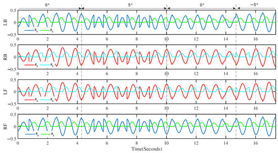 Figure 19 shows the output of the rhythm controller when the robot moves. We can see from the figure that except for the first step, the output state of the rhythm controller is basically the same from the second step to the fourth step. At this time, the robot was on flat ground or just started to climb the hill, and the controller outputted a pattern. At about 3.4 s, the robot was completely on the slope which was 5°, the controller outputted another pattern. Then, the robot entered the 0° slope, and the output of the controller was the same as that of the robot in the flat ground motion until the robot reached the 9° slope, where the rhythm controller outputted the third pattern.