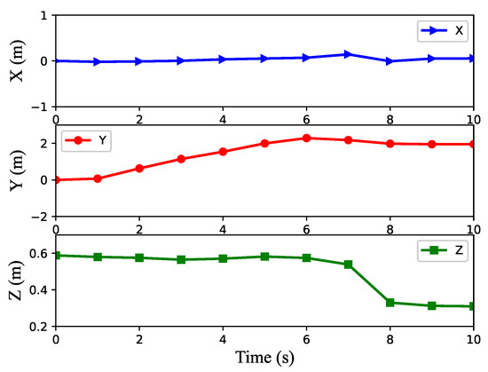 Figure 8 shows the position of the center of gravity when the robot moves on flat ground. The X direction represents the yaw direction, the Y direction represents the forward direction and the Z direction represents the direction of the body shaking up and down during the movement of the robot. It can be seen from the figure that the robot’s position in the Y direction is basically a straight line, which indicates that the robot presents uniform motion in the forward direction, especially during the period from 4.5 s to 9 s. From the Z direction, it can be seen that the robot would shake up and down in the process of lifting its legs and landing. Although there is a small amount of yaw in the X direction during movement, the maximum yaw is less than 0.12 m, and the robot is also corrected in real-time during the movement. Therefore, on the whole, the motion state of the robot is good, which proves that the algorithm proposed in this paper can achieve good movement of the robot.