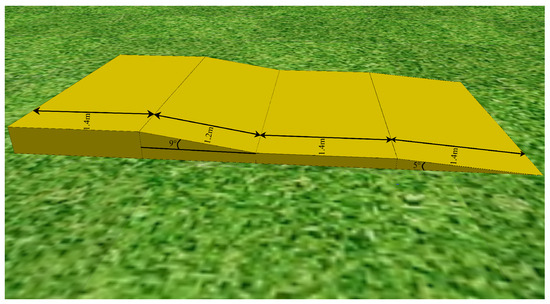 In order to prove that the proposed algorithm can meet the requirements of the environmental adaptability of the quadruped robot, we also carried out an unknown scenario experiment. Under the condition that the robot was well trained with the 5° slope, the slope was changed to the one shown in Figure 16. The slope, called S-4, consisted of four sections, 5°, 0°, 9° and 0°, and each section is 1.4 m, 1.4 m, 1.2 m and 1.4 m, respectively.