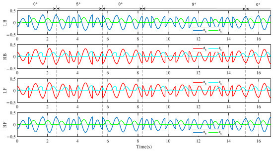 Figure 11 shows the uphill and downhill processes of the robot. Figure 11a,b show the process of the robot from the zero slope to the uphill slope; Figure 11b–d show the process of the robot going uphill; Figure 11d,e show the process of the robot from the uphill to zero slopes; Figure 11e–g show the process of the robot walking on a zero slope; Figure 11g,h represent the transition process of the robot from the zero slope to the downhill slope; Figure 11h,i show the process of the robot going downhill.