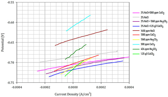 Ding et al. [8] studied the effect of Ca2+, by adding it to the solution as CaCl2, on the CO2 corrosion of API 5L-X65 steel. They simulated a formation water to which they added 64, 128, 256, and 512 mg/L of Ca2+ under stagnant conditions at a 1 MPa partial pressure of CO2 at 75 °C. They concluded that the corrosion rate increased as the Ca2+ ions’ concentration increased.