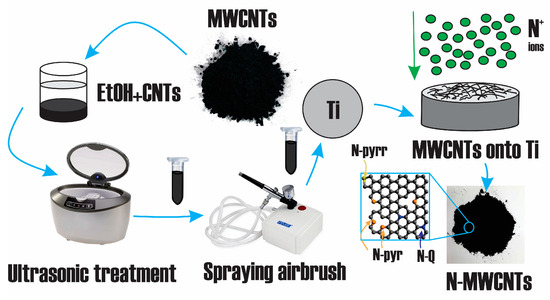 Scheme of preparing N-MWCNTs using nitrogen ion irradiation. The arrows show the individual stages from the beginning to the end of obtaining modified nanotubes.