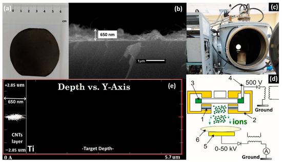 (a) Photograph of an MWCNT layer deposited via aerosol spraying on a Ti substrate; (b) SEM image of cross-section of an MWCNT layer on a Ti substrate; (c) general view of the ion implanter; (d) ion source scheme: 1—magnets, 2—cathode, 3—anode, 4—gas inlet, 5—sample table, 6—sample; (e) calculation of the projective range of N+ ions in a layer of nanotubes 650 nm thick on a Ti substrate.
