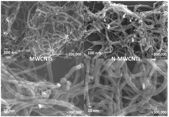 The SEM images in Figure 4 show that the untreated MWCNTs are compared with those subjected to irradiation with a nitrogen ion beam. Examination of these SEM images did not disclose substantial alterations in the morphology of individual nanotubes prior to and following exposure to N+ ions. However, for the N-MWCNTs sample, a slight increase in the average outer diameter (d) of individual nanotubes was observed from approximately 16–18 nm to about 22–25 nm. The observed change in parameter d subsequent to irradiation can be attributed to the partial sputtering of outer nanotube layers, along with the fusion of individual nanotubes at specific locations. Previously, we observed a similar effect when MWCNTs were irradiated with argon ions [13,14,27,47]. This fusion may be associated with the creation of point and extended structural defects as a result of carbon atom removal from nanotube walls. Such removal elevates the free energy of the surface of individual nanotubes.