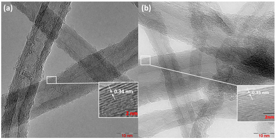 Figure 5 shows TEM images of nanotubes without and after modification. The untreated MWCNTs are cylindrical in shape and contain a hollow part (cavity) in the middle. The outer diameter of the three MWCNTs presented is 12, 13, and 16 nm, and the total number of layers observed is 12, 12, and 15 layers, respectively. The cavity diameter is approximately 5.4–6.4 nm depending on the MWCNT structure. The inset (enlarged area shown in Figure 5a) clearly shows that the untreated MWCNTs have highly ordered layers with an interplanar spacing of 0.34 nm, characteristic of carbon nanotubes [53]. However, on individual MWCNTs, the presence of the first or second layer of the outer layer with signs of disorder is observed. This is also observed for the last inner layers near the MWCNT cavity. In the TEM image of irradiated MWCNTs (Figure 5b), the outer diameter of the MWCNT ranges from 9 to 24 nm, and the inner diameter of the cavity lies between 2.1 and 5.4 nm. It can be seen that thicker MWCNTs are less damaged, while thinner ones are much more damaged. The inset in Figure 5b shows that for thick MWCNTs, damages are observed mainly in the first near-surface layers. It is clear that the interplanar distance in the near-surface region increases from approximately 0.34 to 0.35 nm. In the case of thin MWCNTs, due to the small number of internal layers, the changes are more significant. In general, we can conclude that the internal graphene structure of MWCNTs is preserved after irradiation, although some distortions are observed.