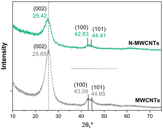 Figure 6 presents the X-ray diffraction patterns of the examined samples. Evidently, for MWCNTs, pronounced peaks manifest at 2θ = 25.7° and 43.1°, 44.6°, corresponding to reflections from the (002) and (100), (101) graphene planes, respectively [10]. On the other hand, in the case of N-MWCNTs, a general decrease in the intensity of the (002) and (100), (101) peaks is noticeable, accompanied by a shift in the most prominent (002) reflection toward smaller angles by 0.3°. These changes occur as a result of exposure to the ion beam, which causes the formation of point and extended structural defects inside nanotube walls due to the incorporation of nitrogen ions. The interplanar distances before and after irradiation were determined using the Bragg’s formula (d(002) = λ/2 sin(Ɵ), where d(002) is the interplanar spacing, λ is the wavelength of Cu Kα radiation (0.15406 nm), and Ɵ is the Bragg angle). The d(002) parameter was found to increase from 3.46 Å (untreated MWCNTs) to 3.51 Å (N-MWCNTs), which correlated with the TEM data (Figure 5). It is important to note that the (002) peak in the X-ray diffraction spectrum of irradiated MWCNTs remains, although it becomes wider and less intense. Combining these analyzed data and TEM data, we can conclude that, in general, the nanotubes retain their crystalline structure after irradiation, and the greatest damages occur mainly in the near-surface region of the MWCNT.