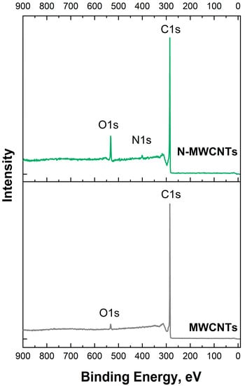 The evaluation of the chemical composition and charge state of atoms within the nanotubes, as well as the determination of the configurations of nitrogen inclusions formed subsequent to irradiation with N+ ions, was carried out using XPS techniques. Examination of the survey PE spectra (Figure 7) obtained in the binding energy range of 1300 to −5 eV for MWCNTs revealed the presence of only the following elements: oxygen (O1s PE line ~532 eV) and carbon (C1s PE line ~285 eV). In the case of N-MWCNTs, the N1s PE line (~400 eV) is additionally observed in the survey spectrum. Thus, we can conclude that after irradiation with a beam of nitrogen ions, there are no extraneous inclusions in the sample. For the quantification of element concentrations, the elemental sensitivity factors method [54] was employed. As depicted in Table 1, the total nitrogen concentration (Ntot) within the irradiated sample is approximately ~1.3 at.%. In addition, an increase in oxygen concentration by approximately ~5 at.% is observed.