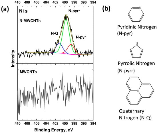 The evaluation of the chemical state of nitrogen was performed using N1s PE spectra (depicted in Figure 9a). As can be seen, in the spectrum of the pristine MWCNTs, nitrogen is completely absent, while in the spectrum of irradiated N-MWCNTs, due to fitting, three components are observed with maxima positioned at binding energies of approximately ~401.2 eV (N-Q), 399.8 eV (N-pyrr), and 398.7 eV (N-pyr). These binding energies correspond to 1s electron energies of the nitrogen atom in graphitic/quaternary, pyrrolic, and pyridinic forms [14] (as depicted in Figure 9b). It is noteworthy that the N-pyrr component has the highest intensity, and its relative contribution to the total intensity of the N1s PE line is 63%, wherein the relative proportions of N-pyr and N-Q are approximately the same and amount to 18.5%. Summing up the results of the analysis of the N1s PE spectrum of N-MWCNTs, it is important to note that as a result of irradiation with N+ ions, all nitrogen atoms are incorporated into the structure of the nanotube walls and chemically bonds with carbon in three configurations. In this case, the fraction of catalytically active nitrogen (nitrogen in pyridinic and pyrrolic configurations) accounts for about 1 at.% of the total nitrogen concentration Ntot (see Table 1).