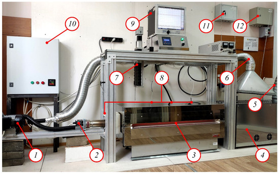 Appearance of the experimental setup: 1—air fan; 2—air heater; 3—muffle furnace with quartz tube; 4—air cooler; 5—exhaust ventilation; 6—heated air recirculation system; 7—mechanism for introducing finely dispersed fuel particles into the heated airflow; 8—thermocouples; 9—multipoint recorder; 10—control panel; 11—power supply board; 12—exhaust ventilation control unit.