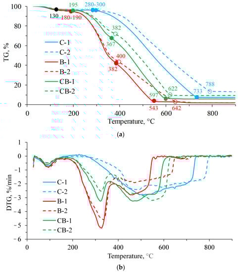 The prepared mixtures contained an equal amount of Chernogorskiy coal and cedar needles. Fractions with a particle size of 100–200 μm (CB-1) and 300–400 μm (CB-2) were used. The first stage of heating is expressed by the DTG maximum in the temperature range of 82–87 °C. When moisture evaporates, mixtures CB-1 and CB-2 lose mass by 3% (Figure 3a). The process of moisture evaporation, just like with individual fuels, is accompanied by the absorption of heat (endothermic effect). Figure 3b illustrates the mixture heating process, which is expressed by three DTG maxima corresponding to the main stages (moisture evaporation, volatile combustion, and coke residue combustion). The second stage of heating corresponds to the beginning of the small molecules decomposition and is accompanied by the release of gaseous volatiles and their further combustion. The second stage is in the temperature range of 195–367 °C for CB-1 and 195–382 °C for CB-2. At the same time, the mass of mixtures CB-1 and CB-2 is reduced by 29 and 26%, respectively. The reduction in the mass of mixtures in the second stage is less compared to B-1 and B-2 due to a decrease in the content of volatiles. The temperature at which ignition of the coke residue occurs for CB-1 was 276 °C, and for CB-2 it was 343 °C. Mass loss during volatile combustion for CB-1 and CB-2 was 29 and 25%, respectively (Figure 3a). The third stage is carried out in the temperature range of 362–597 °C for CB-1 and 372–622 °C for CB-2 and is accompanied by heat release due to the combustion of coke residue from coal and biomass (exothermic effect). During the coke residue combustion, the mass loss for mixtures CB-1 and CB-2 was 62 and 63%, respectively (Figure 3a). The combustion index for CB-1 was 3.12 × 10−8 min−2°C−3; for CB-2, it was 1.97 × 10−8 min−2°C−3.