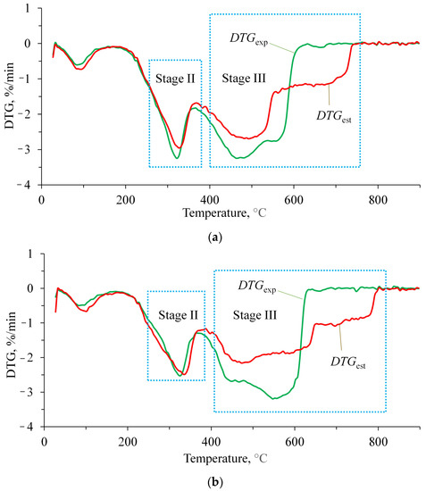The analysis of the mixture component interaction during combustion was carried out by comparing the profiles of the DTG curves obtained experimentally (DTGexp) and by calculation (DTGest). Value DTGest was calculated using the following Equation (2) [29,30]:
