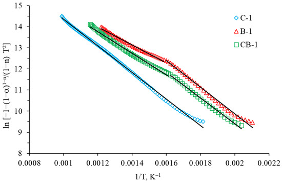 Figure 5 shows a graphical interpretation of the Coats-Redfern equation for all fuels that gave the best linear results. Most of the obtained correlation coefficients (R2) were above 0.99 (Table 3), which indicates the reliability of the calculated profiles. The kinetic curves of B-1 and CB-1 fuels have an inflection that characterizes the change in the fuel combustion mechanism in the studied temperature range. This is confirmed by the change in the reaction order from 0.5 for the initial stage to 1 for the late combustion stage. Perhaps the change in the mechanism is due to the combustion of cellulose. Figure 5 shows the linearization of the Coates-Redfern method for individual fuels and one mixture, since the kinetic parameters do not depend on the size of the fuel particles. The data (Table 3) confirms this.