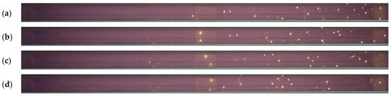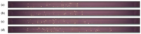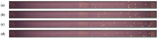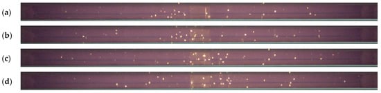 Videograms of ignition and combustion of coal particles (composition C-1) during their movement in a heated airflow at Ta = 700 °C (Δt = 0.01 s): (a) td = 0.099 s; (b) t = td + ∆t; (c) t = td + 2∆t; (d) t = td + 3∆t.