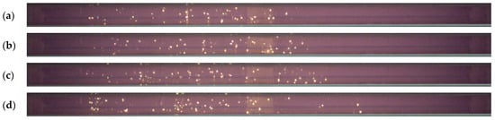 Figure 6, Figure 7, Figure 8, Figure 9 and Figure 10 show typical videograms of high-speed video recording of the ignition and combustion processes of coal and biomass particles, as well as their mixtures. The videograms show the dynamics of the combustion process of finely dispersed fuel particles in a heated airflow at Ta = 700 °C with a step ∆t = 0.01 c from the moment of fuel ignition. The resulting videograms show differences in the distances traveled by combustible particles from the beginning of their heating to the ignition moment and the intensity of combustion under identical initial conditions. The results demonstrate (Figure 6) that coal not only ignites longer than other compositions (larger ignition delay times td), but also has the lowest burnout efficiency. This is clearly visible in Figure 6. The main part of the bright dots (flammable coal particles) is located on the right side of the figure. Cedar needles, on the contrary, are characterized by the shortest ignition delay times (Figure 7). Figure 7 clearly shows that all the points are on the left side of the figure. When biomass with a particle size of 100–200 μm is added to coal, in the video frames of their combustion (Figure 8), all points are located in the left and middle parts of the figure, which characterizes shorter ignition delay times of the fuel mixture. With an increase in the size of biomass particles to 200–300 μm in the frames of the videogram of their combustion (Figure 9), the points are located in the middle part of the figure, which illustrates the increase in ignition delay times. An increase in the size of biomass particles to 300–400 µm leads to a shift of points to the right side of the figure (Figure 10). This indicates that the ignition and combustion characteristics of biomass particles are approaching those of coal.