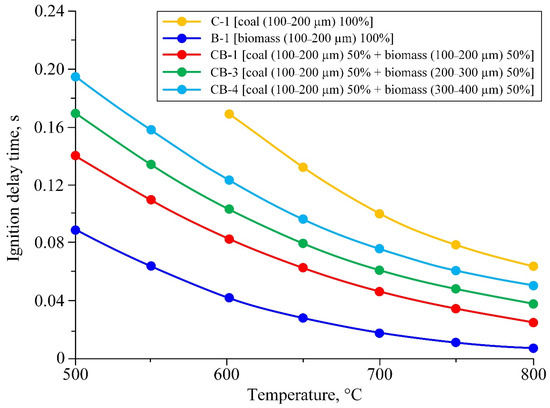 The obtained result is consistent with the studies conducted by Rybak et al. [39]. In this work, it was noted that biomass ignites at a lower temperature since the content of volatiles in its composition is higher (compared to coal). The ignition delay times of biomass are lower compared to coal throughout the entire range of temperatures studied. In addition, ignition times decrease as the temperature of the furnace increases.