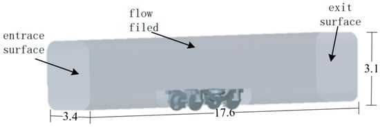 Since the main focus of this paper is to study the sound field distribution between the bogie and the track, it is essential to establish a numerical simulation calculation domain that is as consistent with reality as possible. Thus, the flow field area was set at 60 m, 20 m, and 20 m in length, width, and height, respectively. The bogie is situated 0.3 m above the ground of the flow field area, while the front end of the car body is located 20 m away from the entrance surface of the flow field and 40 m away from the exit surface of the flow field. This ensures that the fluid entering and leaving the bogie area is fully developed. The flow field area is shown in Figure 4.