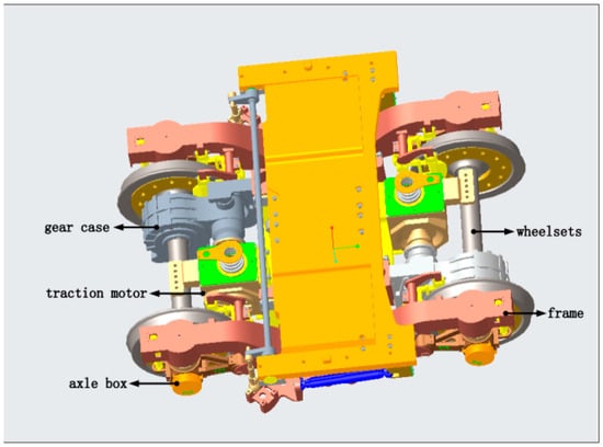 The bogie, located between the track and the car body, is an essential component of a high-speed train. It supports the entire car body, ensures the normal operation of the train, and enables smooth movements on both straight tracks and curves [,]. Therefore, various parameters of the bogie directly affect the safety and stability of the train. Common train bogies today typically consist of a frame, gearbox, traction motor, and axle box (as shown in Figure 2).
