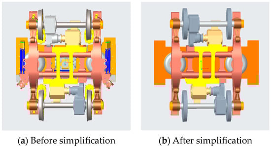 From Figure 2, it can be seen that the bogie structure is intricately composed, and that certain components are constructed with small dimensions. If the un-simplified 3D solid model of the bogie is used directly for analysis, calculation and, meshing, it will greatly increase the computational effort of the latest finite element analysis, increase the possibility of errors, and finally will not improve the accuracy of the final results. Therefore, this paper would simplify the bogie model as follows, as shown in Figure 3.
