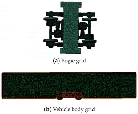 The computational model was initially imported into ICEM, and subsequently, the simplified model underwent a topological check to confirm the presence of all necessary surfaces. Any missing surfaces encountered during the import process were also repaired. Due to the bogie’s complex structure and significant size difference in terms of the flow field and body area, the mesh size was chosen to be defined in blocks. Since the bogie area structure is denser, a non-structural mesh was selected. The meshes were encrypted in the direction of the body to avoid an abrupt mesh and ensure its quality. In order to ensure the calculation accuracy of the acoustic simulation, at least six cells need to be divided within each minimum wavelength. When the linear cell simulation is performed, the speed of sound c and the highest calculated frequency are known, and the cell length should be adjusted by Equation (10) to meet the maximum frequency range that can be covered [] (Volume 17).