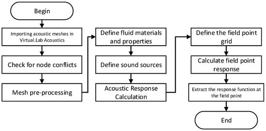 The finite element analysis method under the acoustic module of LMS Virtual.Lab software (13.6) is applied to simulate the trackside sound field of a high-speed train []. The specific flow chart is shown in Figure 6.