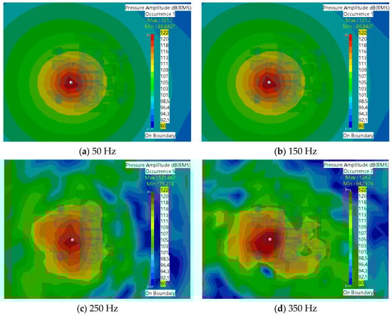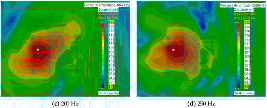 Figure 11 illustrates the sound field distribution in the bogie area at a speed of 30 km/h. The sound pressure level distribution at a frequency of 100 Hz was mainly spread outwards in a circle with the sound source as the center. As the frequency increases, the longitudinal variation of the cloud distribution became significantly greater than the lateral variation.