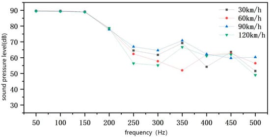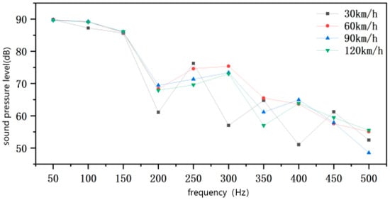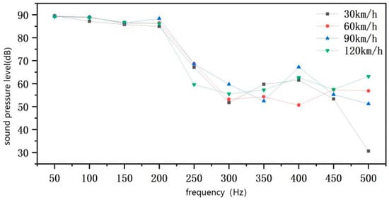 In order to more accurately observe the impact of vehicle speed on the distribution of sound fields from the bogie, a line graph depicting the corresponding sound pressure levels at each vehicle speed is presented in Figure 10. It can be observed from the graph that between 50 Hz and 200 Hz, the minimum value of the sound pressure level increases as the frequency increases. Furthermore, at the same frequency with different speeds, the gradient of the sound pressure level change is roughly the same, with a value of about 1 dB. This indicates that when the sound source is located at the gearbox, the speed of the vehicle has less influence on 50–200 Hz, but only affects the size of the sound pressure level.