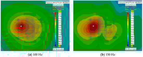 Figure 15 shows the sound field distribution in the bogie area at a speed of 30 km/h. It is evident from the sound pressure level distribution cloud diagram that the sound pressure level increased with the increase in sound source vibration intensity. The maximum value increased from 113.7 dB to 121.7 dB, with a total increase of 8 dB, while the minimum value increased from 79.2 dB to 87.2 dB, also with a total increase of 8 dB. Moreover, the distribution pattern of the sound pressure level cloud map is basically the same: centered on the sound source at the gear box and spreading outward in a circle, with the maximum value located at the lowest part of the sound source.
