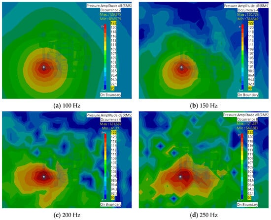 In terms of numerical values, at a speed of 30 km/h, the maximum value of the sound pressure level around the bogie increased with increasing frequency, from 120.9 dB at 100 Hz to 122.1 dB at 250 Hz, resulting in an increase of 1.2 dB. Meanwhile, the minimum value of the sound pressure level continuously decreased, from 89.7 dB to 64.5 dB, representing a total decrease of approximately 25.2 dB.