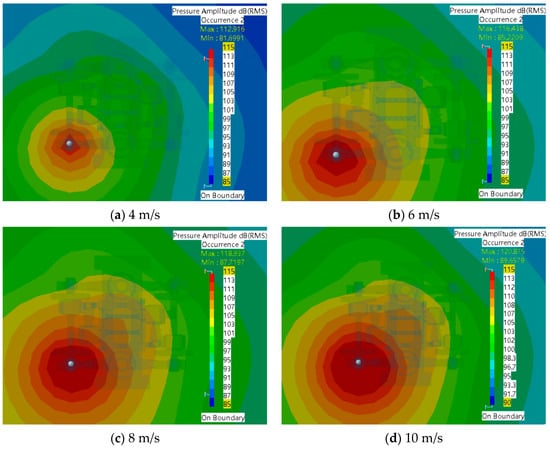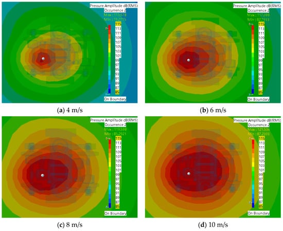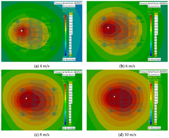 Based on Figure 17, it can be observed that the sound pressure level at the bogie axle box increases as the sound source intensity increases at a speed of 30 km/h. When the sound source vibration speed was 4 m/s, the sound pressure level ranged between 81.7 and 112.91 dB. Meanwhile, when the sound source vibration speed was 6 m/s, the sound pressure level ranged between 85.22 and 116.44 dB. Further, when the sound source vibration speed was 8 m/s, the sound pressure level ranged between 87.72 and 118.94 dB, and finally, when the sound source vibration speed was 10 m/s, the sound pressure ranged between 89.66 and 128.88 dB. It could be deduced that with increasing sound source intensity, the sound pressure level in the bogie area also increases. Nonetheless, the distribution of the sound pressure cloud remains consistent, and the maximum value of the sound source is located below the sound source.