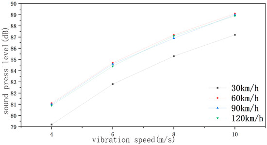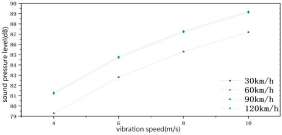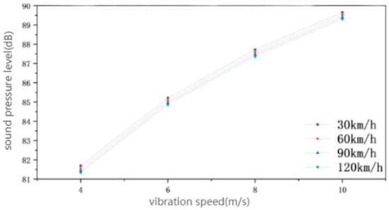 In summary, for better comparative analysis, the sound pressure level change the line graph is drawn, as shown in Figure 16. When the speed of the vehicle is the same, the maximum and minimum values of the sound pressure level will increase with the increase in the vibration intensity of the sound source, and the gradient of the change in the maximum and minimum values is also the same, both of which are 8 dB, so the change of the vibration intensity only has an impact on the size of the sound pressure level, and the degree of impact on the maximum and minimum values of the sound pressure level is basically the same. When the vibration intensity of the source is the same and the speed of the vehicle is increasing, the gradient of change in sound pressure level is also the same, with the maximum value remaining almost constant and the minimum value changing by about 1.9 dB. Therefore, it can be concluded that when the intensity of vibration is the same, the speed of the vehicle on the change in sound pressure level is only a change in size, and the effect on the minimum value is significantly greater than the effect on the maximum value.