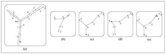 Effective transaction topology diagram. (a) Schematic diagram of local road network, Where the yellow dots represent hubs, the blue dots represent gantry nodes, and the letters A, …, K, denote the names of the portal frame gantry nodes. (b) Effective transaction topology diagram, where blue dots indicate gantry nodes and red dots indicate the starting point of the effective topology. (c) Effective transaction topology diagram, (d) Effective transaction topology diagram, (e) Schematic representation of transaction failures in an efficient transaction topology, where the gray triangles indicate the gantry nodes where the transaction failed.