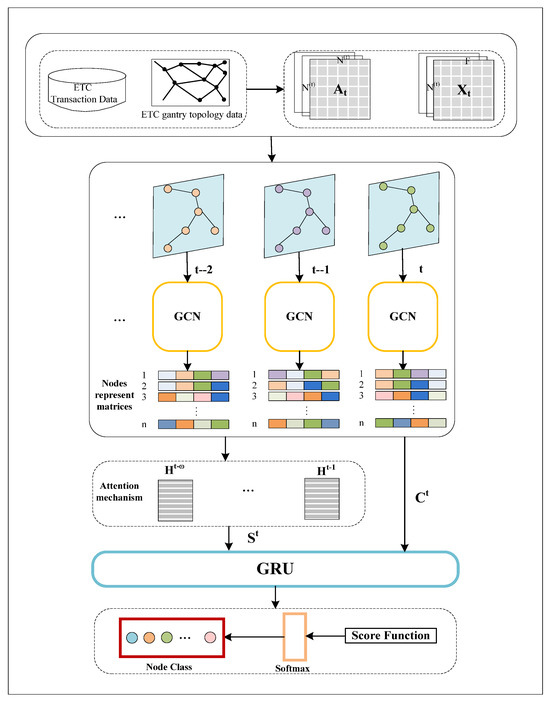 The gantry anomaly dynamic detection algorithm proposed in this paper mainly includes three parts: graph convolutional neural network, attention mechanism, and GRU, and the overall framework is shown in Figure 2. The algorithm first uses the GCN model to model the transaction data and adjacency of the gantry, learns the connection relationship between the gantry nodes and the influence of the transaction data through the GCN, and fuses the node features with the graph structure to generate a new node representation. Then, time-series modeling is performed with the GRU model to capture the time-dependence of the same gantry transactions, which allows for dynamic adjustment of the hiding state and the detection of various anomalies through the computation of reset gates and update gates. Finally, the classification results are obtained through the fully connected layer combined with the SoftMax function.