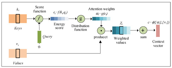Based on the above framework principle of the attention mechanism, corresponds to Query in the graph, which is used to map the approaching time window state to the feature of attention at the current location. corresponds to Key in the graph denoting the approaching time window state of the current node at time step t, which is used to compute the relevance degree. The result Value processed by the mapping function represents the approaching time window state of the current node at time step . The feature representation obtained after processing through the mapping function is used to generate the context representation. The specific calculation process is as follows: