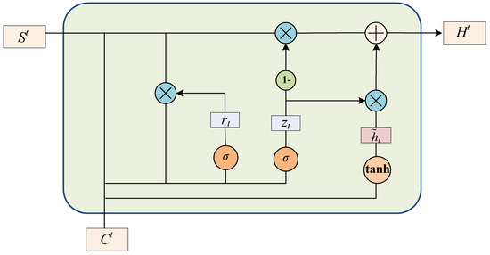 where is the activation function , is the state representation of the gantry node at the current time slice t, obtained by the GCN model aggregation in Section 4.1, is the state representation of the node’s approaching time window, obtained by the contextual attention mechanism in Section 4.2, Equation (16) denotes the current time-heavy storage information, and Equation (17) denotes the calculation of the update gates for the current time, the hidden state of the approaching time window , and the weighted average of the three current pieces of time-weighted storage information . Finally, the hidden state matrix of the node at timestamp t is computed.