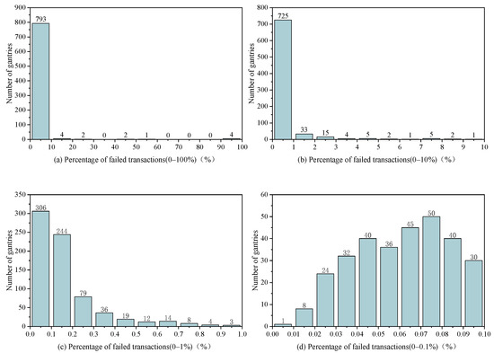 In this paper, the ETC transaction data of 5,143,797 items of a provincial highway on 1 June 2021 were selected for analysis. This study focuses on the transactions mentioned in Definition 4, so redundant data, missing data, and erroneous data were eliminated. The following is an analysis of the transaction data for the 806 gantries on 1 June. Figure 6a shows the distribution of the different percentages of failed gantry transactions, and it can be seen that most of them are concentrated with a failure rate of 10% or less. In order to gain insight into the majority of gantry deal failures, this paper further analyzed the data with an anomaly rate of 10%. Figure 6b–d demonstrate the distribution of gantries with anomaly rates of 0–10%, 0–0.1%, and 0–0.01%, respectively, The share of failed gantry transactions is distributed at intervals of 0–10%, and 0–0.1%, with a decreasing trend in the number as the share increases. The number of gantries is more evenly distributed in the 0–0.01% interval compared to the other intervals.