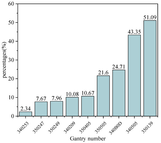 Based on the above gantry transaction share scenarios, this paper further analyzes the gantries with high failure rates and those with low failure rates, respectively. First, we select nine gantries with transaction failure rates at five intervals of 1–5%, 5–10%, 10–20%, 20–50%, and 50–100%, whose transactions are shown in Figure 7. Then, a local topology containing these nine gantries was selected based on the standard topology of gantries. The local topology contains eight sections, and contains gantries with low failure rates that are connected to the nine gantries, which have failure rates between 0 and 0.1%. Finally, the transaction data containing these eight road segments were filtered out of the 5 million ETC transaction data.