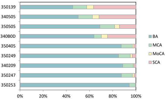The following paper analyzes the failure of gantry deals in these eight specific sections. The percentage of each type of anomaly for gantries with high failure rates is presented in Figure 8. These gantries mainly exhibit the four anomalies in Definition 5, with BA having the highest percentage of each of them. As the transaction failure rate increases, the proportion of SCA gradually increases and the proportion of BA gradually decreases. For example, gantry 350,139 has the highest transaction failure rate in Figure 7, and in Figure 8, this gantry has the lowest percentage of BA and the highest percentage of SCA compared to other gantries.