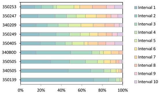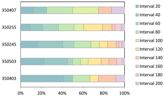 An analysis of the sudden anomalous BA of the gantries with high failure rates was carried out as shown in Figure 9, which presents the transaction failures generated by different numbers of vehicles at different intervals. For gantry 350,139, with the highest transaction failure rate, the highest percentage of intervals 1 was found. The percentage of all types of intervals decreases as the intervals increase, indicating that the frequency of intervals leaking from this gantry is high.